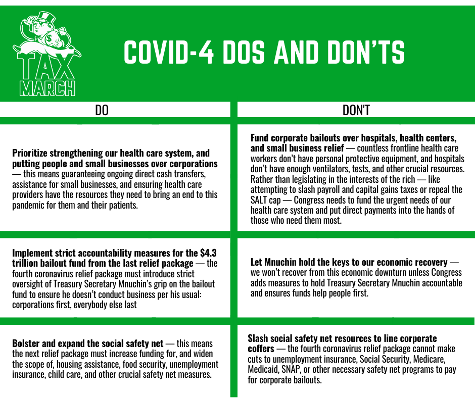 WASHINGTON, D.C. — With Congress moving toward negotiations on a fourth coronavirus relief package, Tax March has released a list of ‘Do’s and Don’ts’ to help ensure that future relief efforts go to average people and families, not big corporations. The last relief package from Congress included a corporate bailout fund that could be leveraged to $4.3 trillion, but only allocated a modest fraction of its funding toward, you know, actual people. So this time, we’ll be extra clear about what to do — and not do — in the next bill.